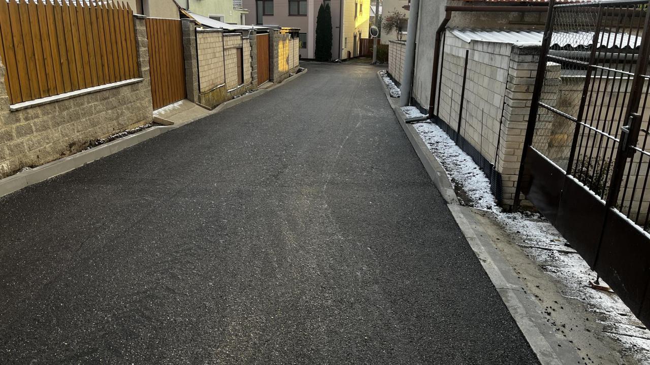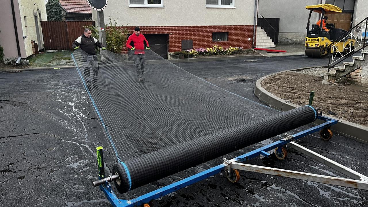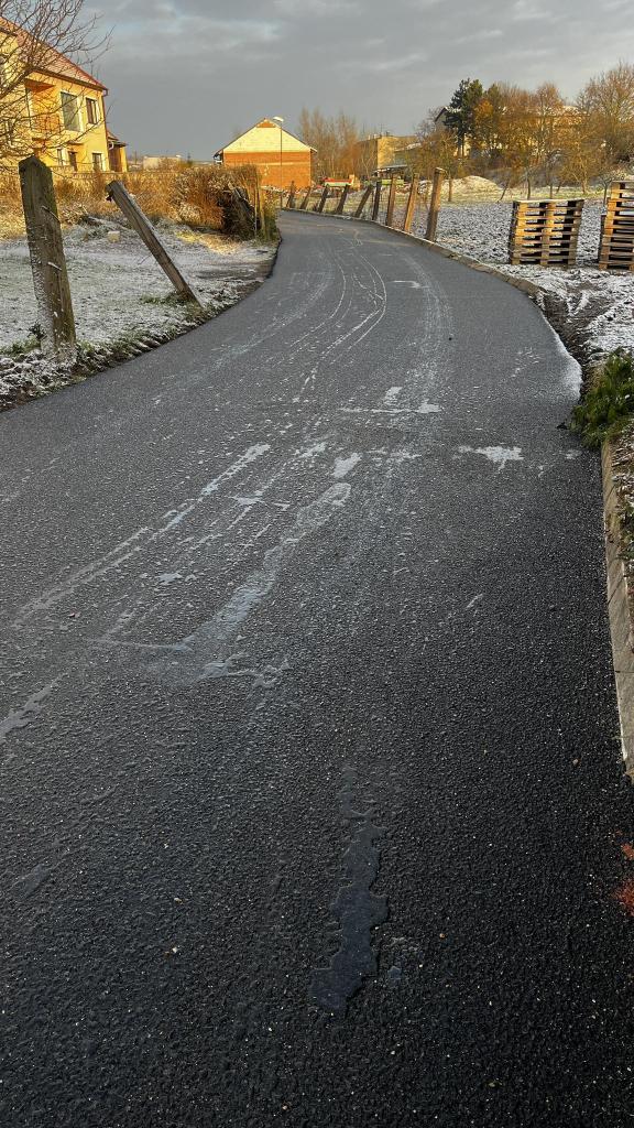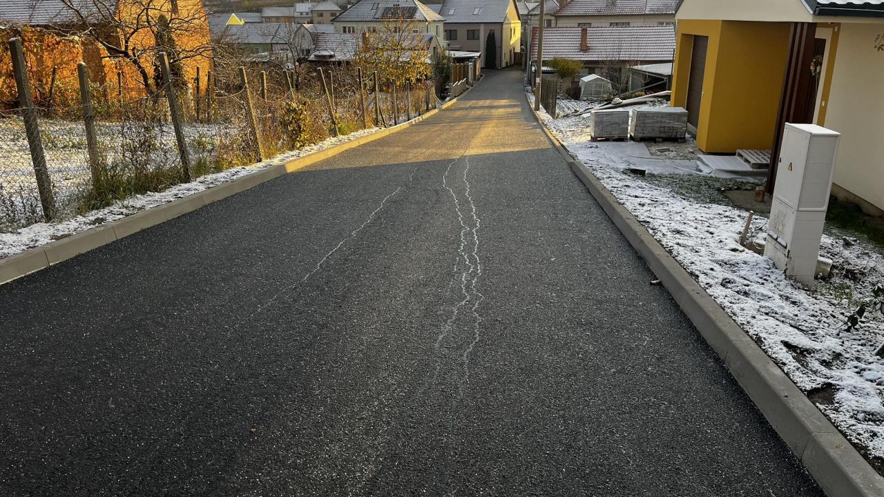 Těsně před příchodem dnešních ranních mrazů se nám podařilo dokončit práce na rekonstrukci ulice Obecní humno. Mezi první a druhou vrstvu asfaltového povrchu byla instalována speciální textilní mřížka pro zvýšení únosnosti a pevnosti povrchu. Ještě dojde ke kosmetickým úpravám za obrubníky, vyčištění a dosypání chybějící hlíny.