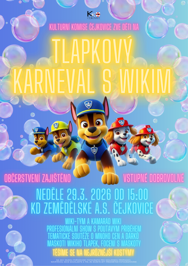 Kulturní komise Čejkovice srdečně zve všechny děti, rodiče i prarodiče na veselý karneval plný pohybu, her a zábavy inspirovaný oblíbenými psími hrdiny.
