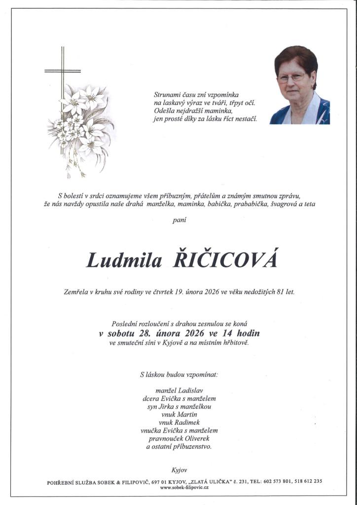Rodina Řičicova z Kyjova oznamuje rodině, přátelům, známým a spolužákům, že zemřela paní Ludmila Řičicová, rodačka z Čejkovic. Poslední rozloučení s drahou zesnulou se koná v sobotu 28. února ve 14:00 hodin ve smuteční síni v Kyjově.