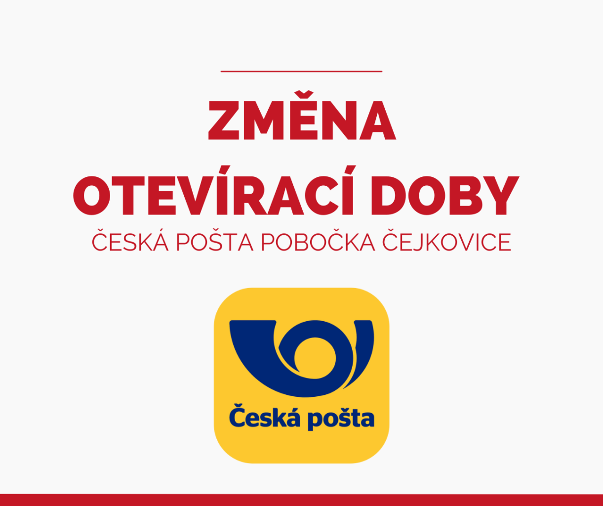 Česká pošta, pobočka Čejkovice oznamuje, že v pátek 27.02.2026 bude mít z provozních důvodů otevřeno pouze od 8:00 do 11:00 hodin.
